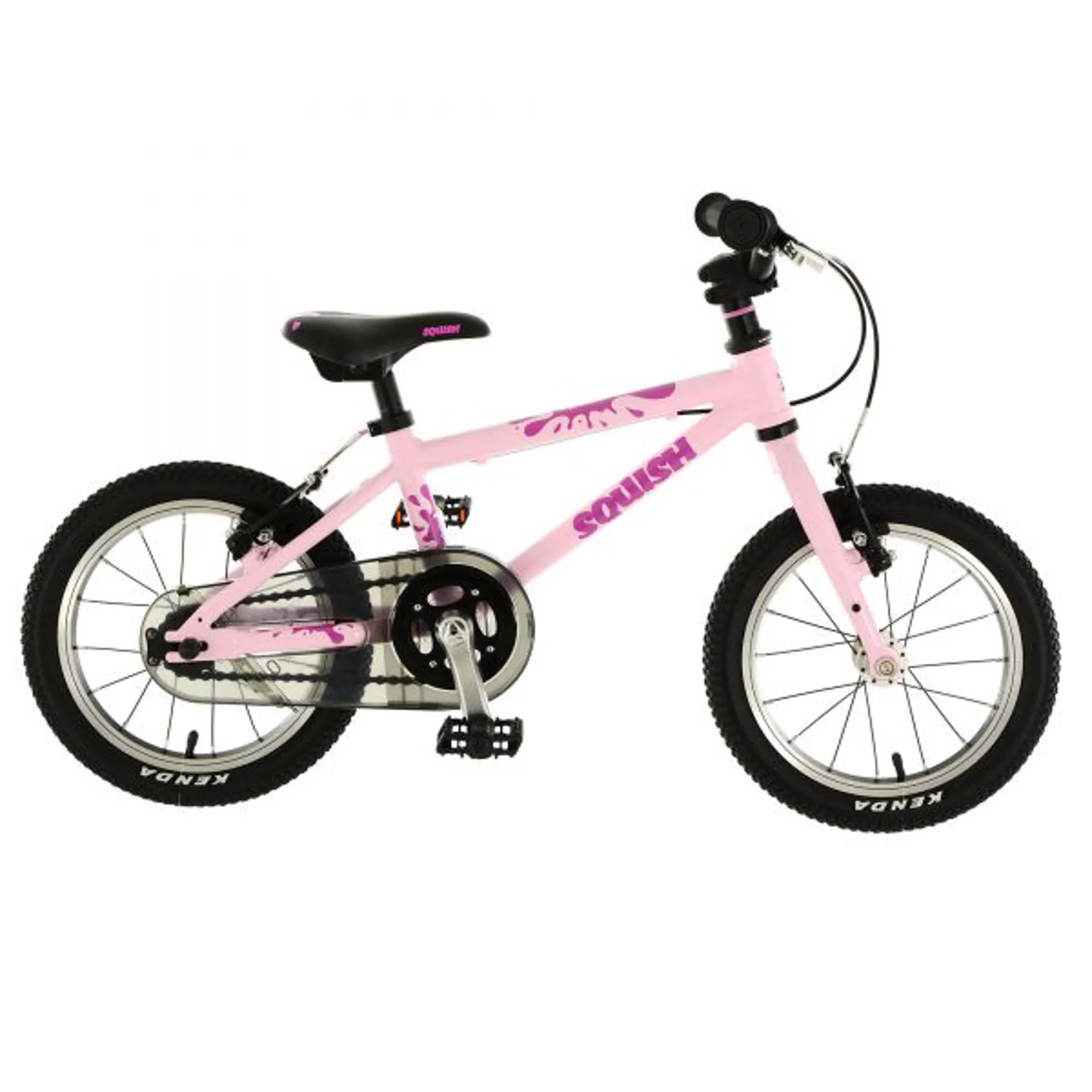 The perfect introduction to 2 wheels! The Squish 14 has been built to be as lightweight, and as easy to use as possible. 14″ wheels and an 8″ triple butted frame make it ideal for riders of 3 years and above. With it’s shortened crank arms, stubby stem, short reach brake levers and funky Selle Royal/Squish co-branded saddle, it not only looks cool but is ideally in proportion with it’s intended rider. We’ve even treated the rims to CNC sidewalls to help increase braking performance and safely tucked away the chain and cogs with a fully enclosed chainguard, great for protecting clothes…and curious little fingers! All this, and weighing just 5.83kg