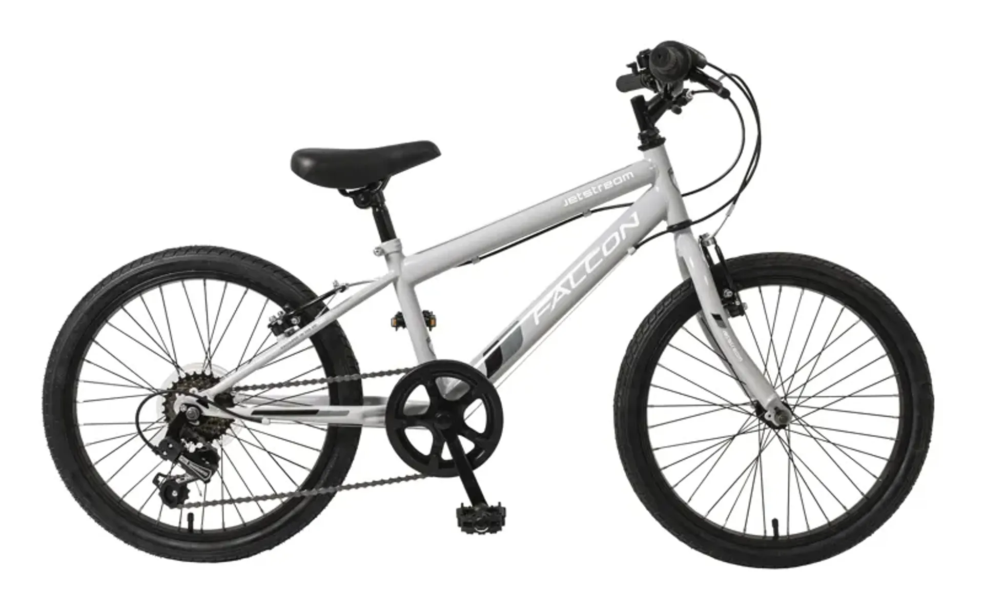 The falcon jetstream rigid 20? Bike has been designed with junior riders aged 6-9 years in mind with a carefully considered frame geometry that helps ensure a comfortable and safe riding position. The hi-tensile steel frame is strong and durable while the lightweight rigid fork provides a stable ride for children not used to suspension, whilst reducing vibrations from the pavement thanks to the curved lower section. As well as being great looking, the jetstream has a great spec to match. 6-speed gearing is powered by a Shimano rear derailleur and revoshift shifter, ensuring smooth gear changes without losing grip of the handlebars. The double-sided chainwheel guard protects fingers and clothes and prevents the chain from slipping off the chainring. MTB style pedals provide reassuring grip and the soft compound handlebar grips are durable and comfortable to hold. Braking is taken care of by reliable front and rear v-brakes with specially designed reach-adjustable brake levers that can be adjusted to accommodate smaller hands. The jetstream is ideally suited to grow with young riders thanks to the longer 250mm seat post, adjustable saddle fore and aft position and quill handlebar stem that can be adjusted up and down to suit. The wheels are assembled with strong yet lightweight alloy rims and all-surface tyres for riding across a variety of terrain. The falcon jetstream really is a cut above the rest and the perfect bike for young riders looking to progress and learn how to use gears. Most suitable for children aged 6-9 years. Inside leg measurement of 51-64 cm/20-25?
